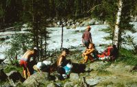 Unsere Gruppe verteilt sich; Kondition und Gepäck sind zu unterschiedlich. Jörg trägt inzwischen einen Teil von Almuts Gepäck mit und verausgabt sich überdurchschnittlich. Wir verlieren uns und versuchen irgendwann, aufeinander zu warten - was aber schiefgeht, weil wir nicht genau wissen, wer vorn und wer hinten ist. Bevor wir unsere Kraft mit weiterer Suche verbrauchen, gehen wir weiter in dem Wissen, daß wir kurz vor unserem Ziel sein müssen.