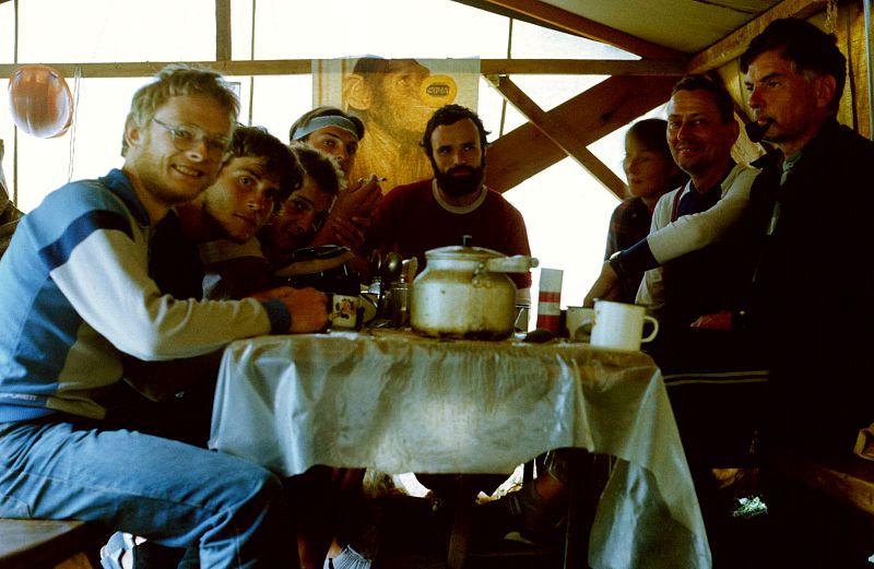 Auch später, wieder im Lager, können wir nicht davon lassen, die gewaltigen Fels- und Schneewände des Berges durch ein Fernglas zu betrachten, welches wir von tschechischen Alpinisten ausleihen.
