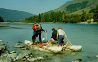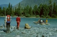 Es geht alles gut, die Steuermänner versuchen mit ihren Paddeln mit aller Kraft, die Höhe zu halten - trotzdem landet jede Überfahrt einige Hundert Meter flußabwärts am anderen Ufer. So müssen die Sportfreunde viermal mühevoll ihren Katamaran wieder flußaufwärts zur ursprünglichen Anlegestelle ziehen, bevor wir alle am anderen Ufer und sie selbst wieder bereit zur Weiterfahrt sind. Mehr als ein paar kleine Präsente wie zum Beispiel Kugelschreiber haben wir nicht zu bieten. Aber alle wissen, daß gegenseitige Hilfe beim Unterwegs-Sein in diesem riesigen Land überlebenswichtig sein kann und daher fast eine Selbstverständlichkeit ist.