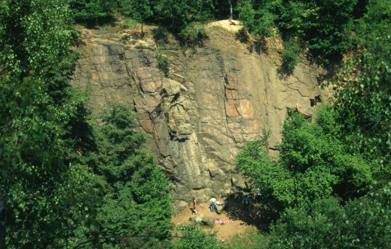 Die nebenstehende anklickbare Übersicht bietet eine Anstiegsskizze mit den Namen und Schwierigkeitsgraden der Kletterwege im Steinbruch. Sie entspricht inhaltlich den Angaben im Kletterführer "Zittauer Gebirge und andere ..." von 1993.