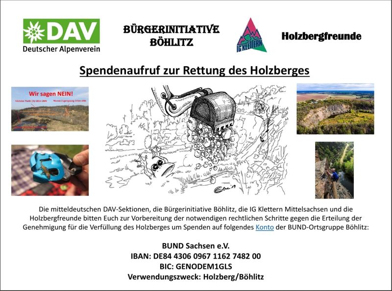 Aktuelle News Holzbergfreunde Spendenaufruf zur Rettung des Holzberges Es ist 5 vor 12! Macht bitte mit und schickt es an Natur- und Kletterfreunde weiter! "Wir als Holzbergfreunde möchten in Zusammenarbeit mit der Bürgerinitiative Böhlitz, den mitteldeutschen DAV-Sektionen, der IG Klettern Mittelsachsen und den Naturschutzverbänden in Sachsen durch Gespräche mit der Regional- und Landespolitik, den zuständigen Behörden und den beteiligten Firmen (KAFRIL und BASALT AG) eine Lösung zu finden, wie der Holzberg ohne jegliche Verfüllung in seiner jetzigen Form erhalten werden kann. Dazu gibt es aktuell Gespräche auf Landkreisebene, die bisher aber noch keine konkreten Lösungen ergeben haben." Unabhängig davon hat die Firma KAFRIL im März 2020 beim Umweltamt des Landkreises Leipzig den Antrag für die naturschutzrechtliche Ausnahmegenehmigung für die Verfüllung des Holzberges eingereicht. Dadurch sind wir gezwungen zeitnah zu reagieren und uns auf den Worst Case - die Erteilung der Genehmigung zur Verfüllung des Holzberges - vorzubereiten. Dazu hatten unsere Mitstreiter von der Bürgerinitiative Böhlitz bereits im Vorfeld eine Ortsgruppe des BUND Sachsen gegründet. Als anerkannter Naturschutzverband ist der BUND Sachsen berechtigt, im Genehmigungsverfahren vor der Entscheidungsfindung seine Mitwirkungsrechte geltend zu machen und er ist außerdem klageberechtigt. Alle erfordlichen Dokumente für diesen möglichen Klageweg über den BUND Sachsen sind unterschrieben und es wurde auch bereits Kontakt zu einer kompetenten Rechtsanwaltskanzlei in Leipzig aufgenommen. Ein derartiger Rechtsstreit erfordert umfangreiche finanzielle Mittel in der Größenordnung von ca. 15.000,- EUR, die nicht durch einige wenige Einzelpersonen aufgebracht werden können. Daher bitten wir Euch um eine Spende auf das folgende Konto der BUND-Ortsgruppe Böhlitz: BUND Sachsen e.V.Bitte vergesst nicht den Verwendungszweck HOLZBERG anzugeben!" ![]() |